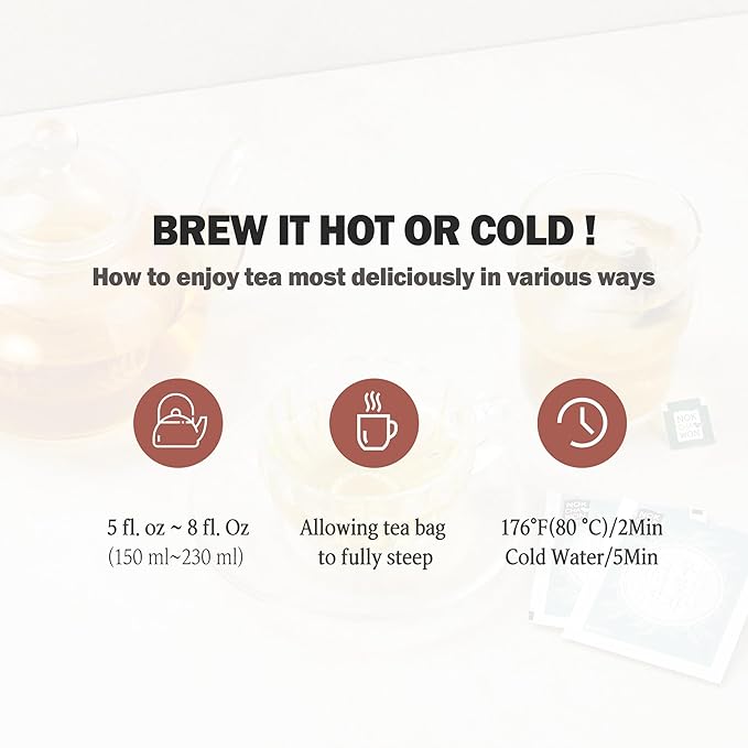 - HOW TO ENJOY: Soak a tea bag in 6 to 8 ounces of water for about 2 minutes, depending on your preference. Hot water enhances the flavor of the tea. Of course, tea bags brew well in cold water, so you can enjoy cold brew tea deliciously, even in summer.