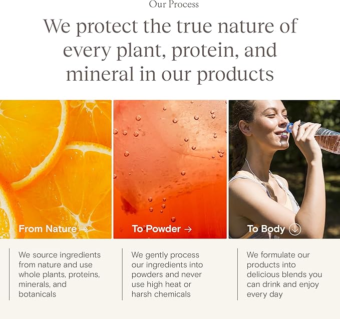 - “From Nature to Powder to Body.” We thoughtfully choose natural ingredients, handle them with loving care, and deliver them to you with all the nutritional benefits – the life – intact.