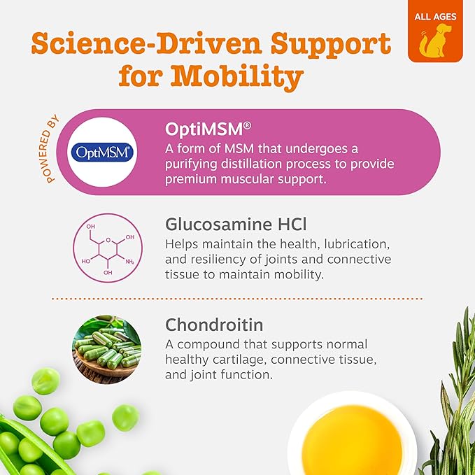 - OPTIMSM FOR MUSCLE SUPPORT: With 400 mg per 2 chews, this dog joint supplements includes OptiMSM distilled for purity, providing superior muscle support to keep your pet active and healthy throughout their life