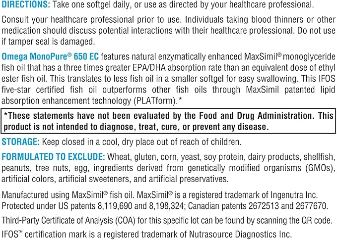 - Take Fewer, Smaller Softgels - Thanks to their advanced absorption, Omega MonoPure can offer users smaller fish oil omega 3 supplements. This means they're easier to swallow, and users only need to take one softgel per day.*