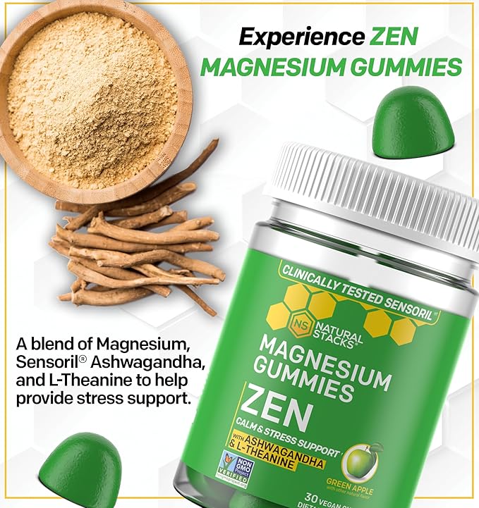 - Experience MagZen - Get all the support you need to manage daily stress with Natural Stacks Magnesium Zen gummies. These tasty magnesium citrate stress gummies are combined with Ashwagandha and L Theanine to help reduce feelings of irritability and negativity.