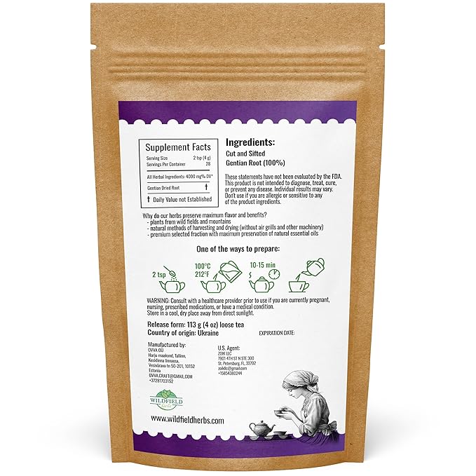 - Weight of Gentian Root Tea: 4 oz (113 g). These Gentian herb have been grown, carefully harvested, specially dried and specially packaged to ensure that they reach the customer in the freshest and most fragrant condition.