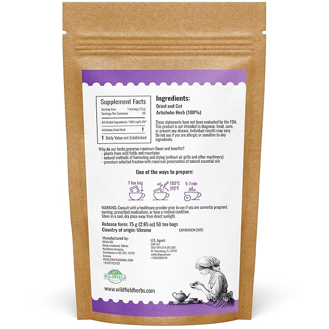 - 50 Bags of Artichoke tea. These Artichoke tea leaves have been grown, carefully harvested, specially dried and specially packaged to ensure that they reach the customer in the freshest and most fragrant condition.