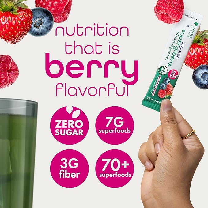 Zena Nutrition Organic Super Greens Powder, 70+ Superfoods, 0 Sugar, 3g Fiber, Spirulina, Chlorella, Mushrooms, Prebiotics/Probiotics, Digestive Enzymes, Gut Health, Mixed Berry, 30 Drink Mix Packets