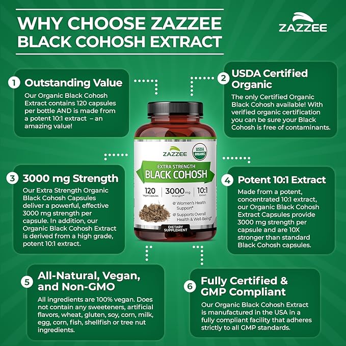 - USDA CERTIFIED ORGANIC: Any Black Cohosh that is not CERTIFIED organic can be highly contaminated and even harmful. With Zazzee Naturals Certified Organic Black Cohosh, you can be sure your Black Cohosh is organic, all-natural, vegan, and non-GMO. More, while other competing products use various chemicals as fillers, binders, and excipients, our Organic Black Cohosh instead uses a unique blend of organic stabilizers.