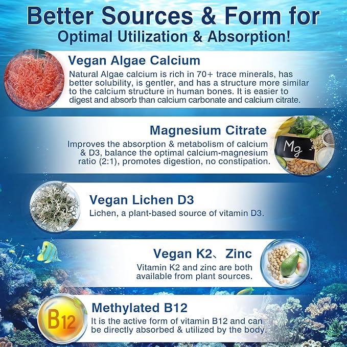 - Better Source & Form: Our calcium is natural algae calcium, rich in 70+ trace minerals, with better solubility, gentler, and a structure closer to the calcium structure in human bones, which is easier to digest and absorb than calcium carbonate & calcium citrate. Magnesium citrate is an organic acid magnesium salt with high bioavailability & easy absorption. D3, K2, Zinc are both from plant sources. Vitamin B12 is methylated B12, which is the active form & can be directly absorbed & utilized.