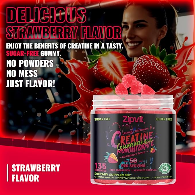Zipvit Creatine Monohydrate Gummies (5g) – Pre-Workout Energy & Muscle Growth Support for Men & Women | Strawberry Electrolyte Gummies (135 Count)