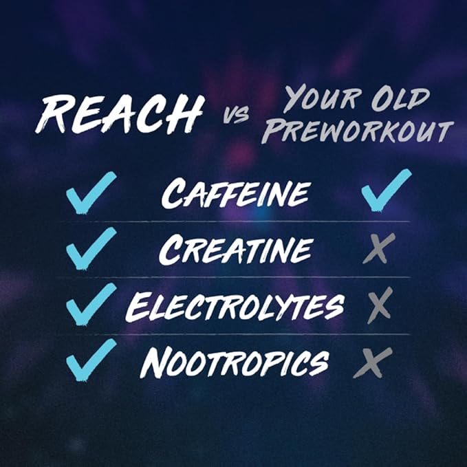 - Clinically Dosed Creatine for Maximum Power: Boost your workout performance with Reach Pre Workout, featuring clinically dosed creatine monohydrate to enhance muscle power and ATP production for more intense training sessions.