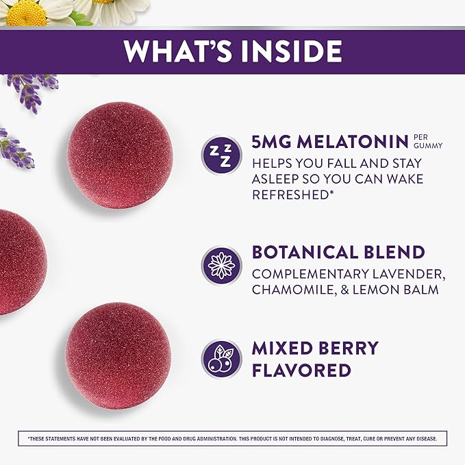 - COMPLEMENTARY BOTANICAL BLEND: This 5mg melatonin gummy sleep aid contains a complementary blend that includes botanical extracts of chamomile and lavender