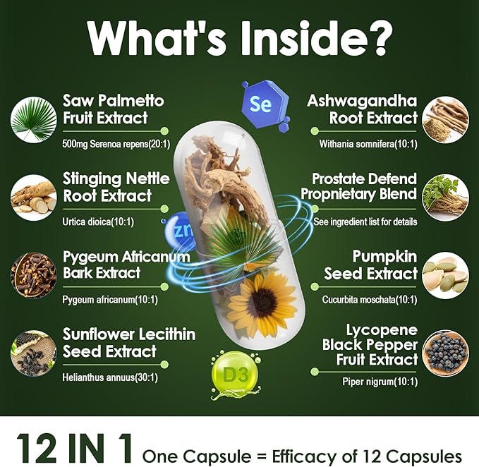 - 15X Formula: 500mg organic saw palmetto fruit extract (containing 85-95% fatty acids), synergistic with 15 herbal essences such as African pygeum/nettle root/pumpkin seed, clinically proven to support urine flow strength (increase urine flow by 27%) and reduce nocturia (83% of users reported improved urination regularity), precisely targeting BPH symptoms such as urinary waiting/weak urination.