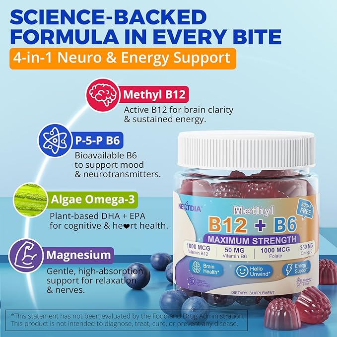 - [Natural Energy, Mood & Nerve Support]: Our Vitamin B12 + B6 gummies feature an expertly crafted formula that combines Methyl B12, active B6 (P-5-P), L-Methylfolate, Magnesium Citrate, and 600 mg of algae oil with 350 mg of Omega-3s (EPA & DHA). This synergistic blend helps reduce fatigue, support mood balance, promote healthy nerve signaling, and enhance relaxation โ all in forms that are gentle on digestion.Support for daily energy, focus, and vitality.