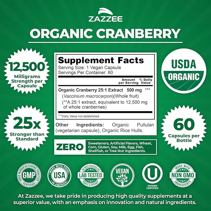 - USDA CERTIFIED ORGANIC: Any Cranberry that is not CERTIFIED organic can be contaminated and toxic to your body. With Zazzee Naturals USDA Certified Organic Cranberry, you can be sure your Cranberry Capsules are organic, all-natural, vegan, and non-GMO. More, while other competing products use various chemicals as fillers, binders, and excipients, our Organic Cranberry instead contains only all-natural, organic stabilizers.