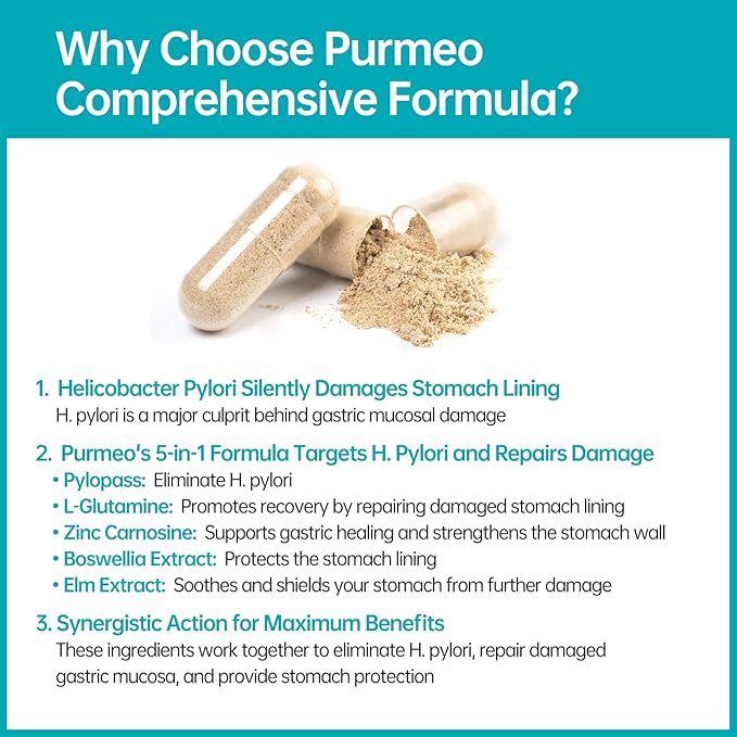 - REPAIR GASTRIC MUCOSAL DAMAGE: H. pylori is a major culprit behind gastric mucosal damage. Purmeo H. pylori support capsules include elm extract and boswellia extract to relieve stomach discomfort, protect the stomach lining and soothe and shield your stomach from further damage