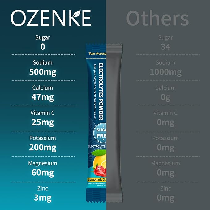 - Quick Hydration: OZENKE electrolyte powder packets have a professional formula that helps to replenish lost water and electrolytes in our body quickly. It contains essential electrolytes like Potassium, Sodium, Magnesium, Zinc, and Calcium, which help maintain osmotic pressure of intracellular and extracellular fluids. Prevent dehydration due to exercise with ease!
